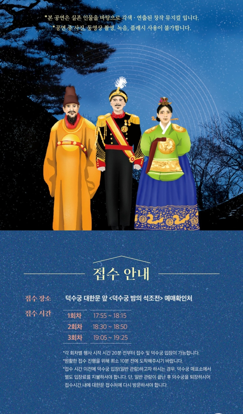 역사적 사실을 바탕으로 한 이 공연은 덕수궁의 역사를 더욱 깊이 이해할 수 있는 기회를 제공합니다. 덕수궁 야간개장 시간에 펼쳐지는 이 특별한 공연은 관람객들에게 감동과 교훈을 동시에 선사합니다.