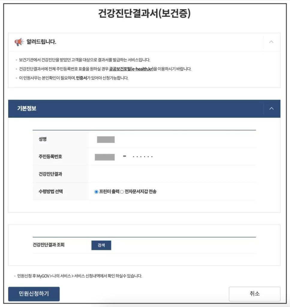 - 건강진단결과서 조회하기: 메인 화면에서 '민원서비스' → '진료/검사현황 조회' → '검진결과조회' → '건강진단결과서 출력'을 차례로 클릭합니다.