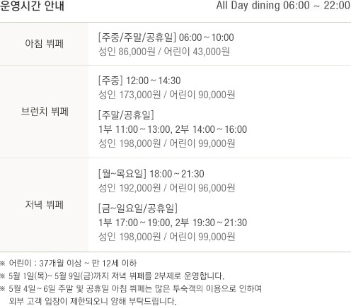 - 주말 디너: 성인 198,000원 / 어린이 99,000원