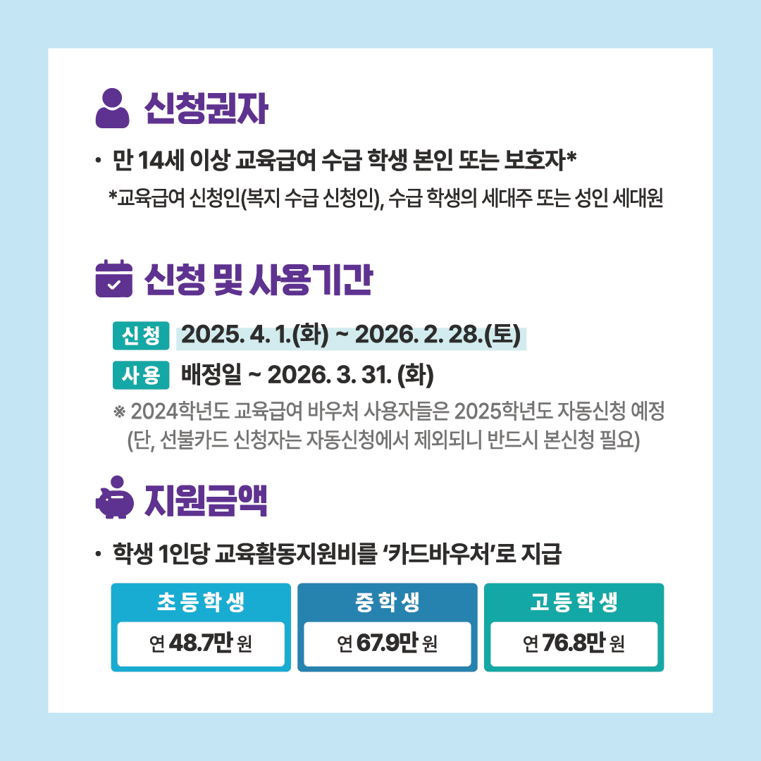 자격 요건을 충족하는 가정이라면 반드시 신청하시기를 권장합니다. 신청 기간과 절차를 미리 확인하여 놓치지 않도록 주의하시고, 교육급여 바우처를 통해 자녀에게 더 나은 학습 환경을 제공해보시기 바랍니다.